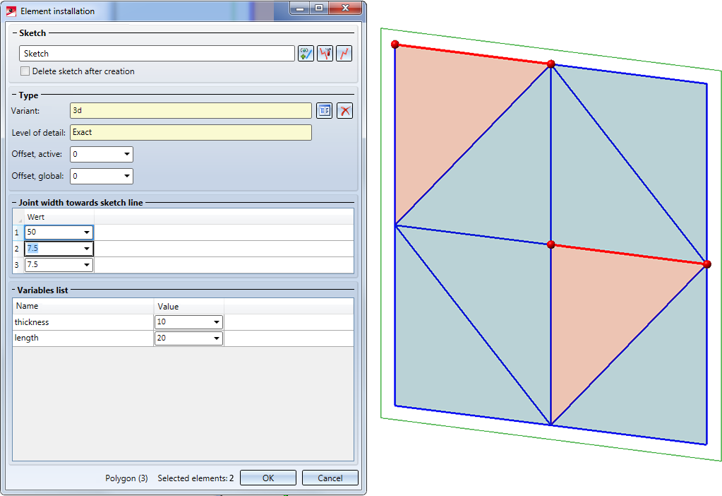 Furthermore, you have the option to use variable installation elements by using the part variable i_nr. You assign a number of corners n to this variable. In this way it is ensured that these installation elements are adjusted to sketch areas with a maximum of n corners and thus can be installed there. For instance, if the i_nr variable is set to 5, the installation element can be installed on sketch areas with 3, 4 and 5 corners. Further information on the i_nr variable can be found here.