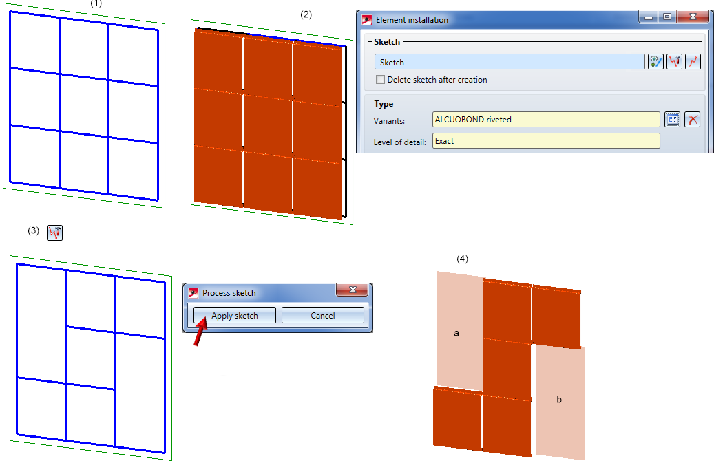 In the image below the Sketch (1) has been selected. For all sketch areas (2) the variant ALUCOBOND riveted has been selected, but the calculation has not been started yet. If you now process the sketch as shown below (3) and then apply it (4), the variant needs to be reassigned for the sketch areas a and b.