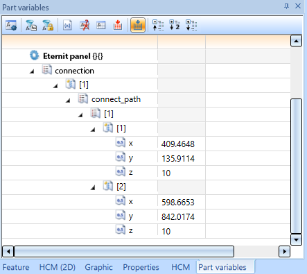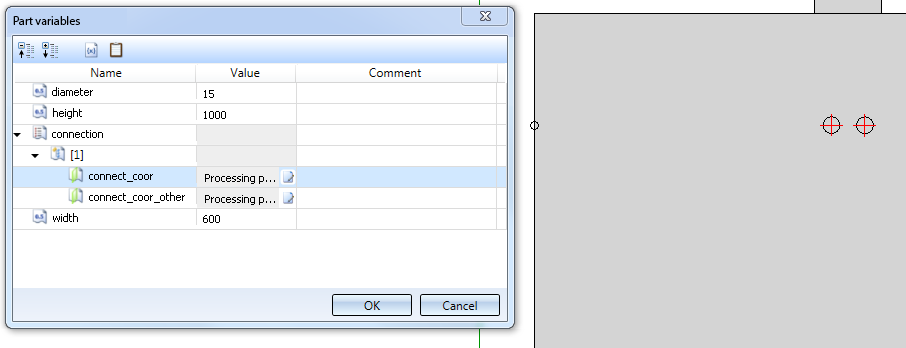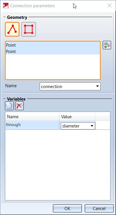 - For the active part, the intersection points will be saved as part variables. A list variable named according to the Name in the Connection parameters dialogue will be used for this.