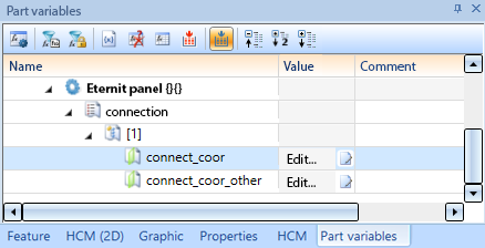 - Variables - A list of variables that is to be additionally set for the connected part. These in turn consist of: