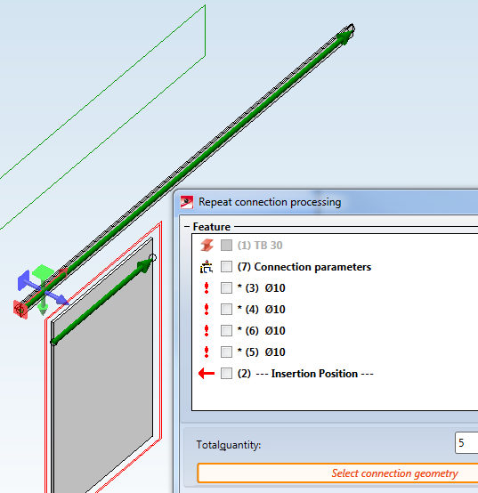 button, all connection geometries will be highlighted by green arrows in the model drawing. Choose the desired connection geometry with a left-click.