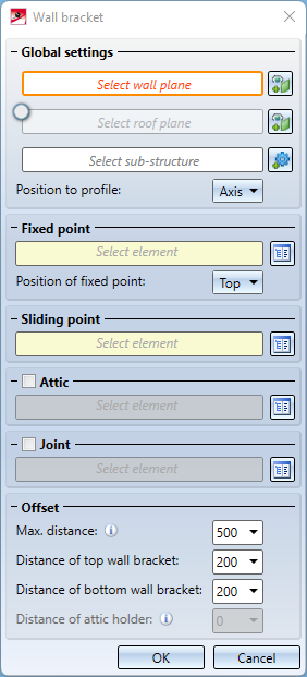 If the sub-structure is with attic, a wall bracket for the attic can also be attached. To do this, you can activate the Select roof plane field and then select the roof plane here. Finally, Select the sub-structure in the field of the same name. Here you have the option of selecting the entire sub-structure assembly in order to provide the entire sub-structure with wall brackets - or alternatively only a single profile of the sub-structure in order to provide only this profile with wall brackets.