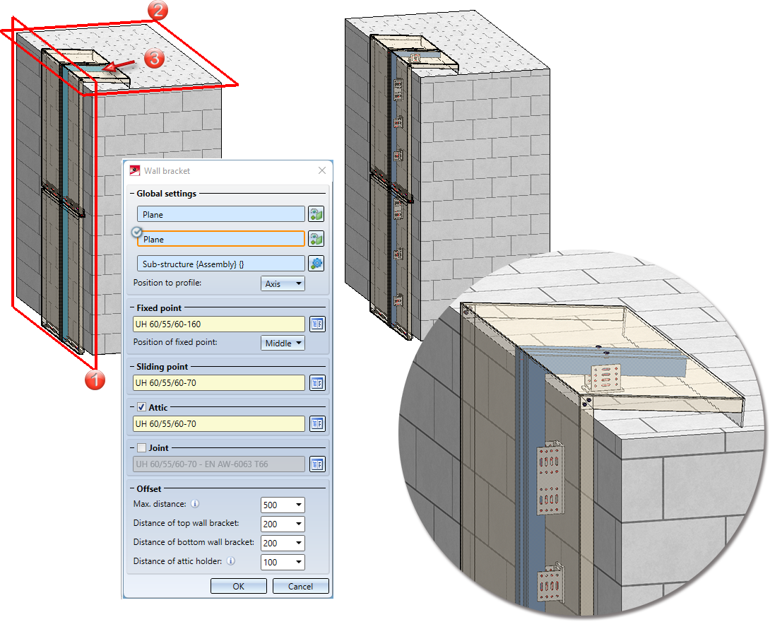 In order to insert the wall brackets, use the function Element installation > Wall bracket in the Civil Engineering functions docking window. The front of the wall is selected as the Wall plane, and the sub-structure just created is selected as the sub-structure. The previously created wall bracket is selected as both the Fixed point and the Sliding point.