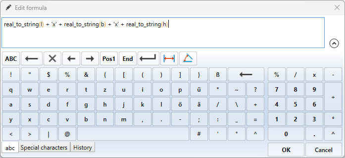For example, enter the formula real_to_string(l) + 'x' + real_to_string(b) + 'x' + real_to_string(h).