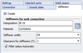 On this tab you specify the type, material and size of the stiffeners for the web connection. Furthermore, you can specify a clearance for the stiffeners. If the Fillet radius automatic checkbox is activated, HiCAD will determine the radius of the stiffener automatically. Deactivate the checkbox if you want to specify the radius by entering a value.