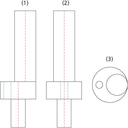 This example shows the conversion of a 2-D drawing to a 3-D drawing using the Views, Revolved solids and Through holes functions. Basis for the conversion is the 2-D drawing shown below (REKO_BSP5.SZN) containing front view (1), side view (2) and top view (3) of a 2-D shaft.