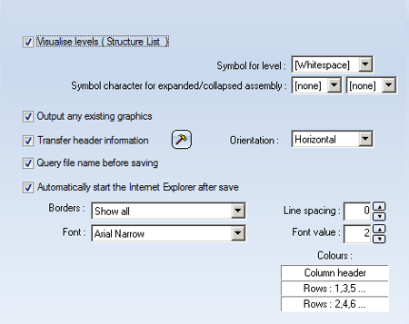This tab enables you to specify the settings for the export of Structure Lists and Quantity Lists as HTML files.