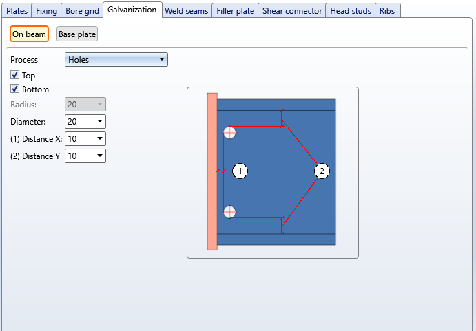 Here you specify whether you want to apply holes for galvanization processes to the base plate and the reference beam. Activate the corresponding sub-tabs on the left hand side for this purpose.