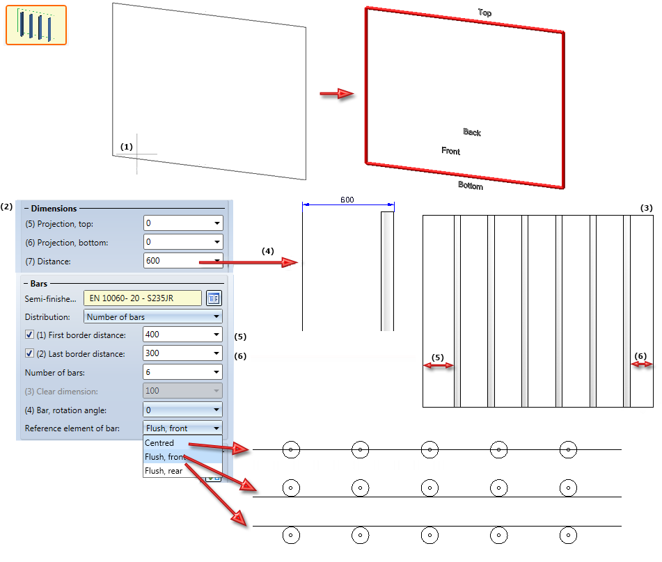 (1) Lower edge of a square sketch, (2) Settings, (3) Result in the front view, (4) Distance in the side view with the setting reference element from profile bar: flush front, (5) First border distance, (6) Last border distance