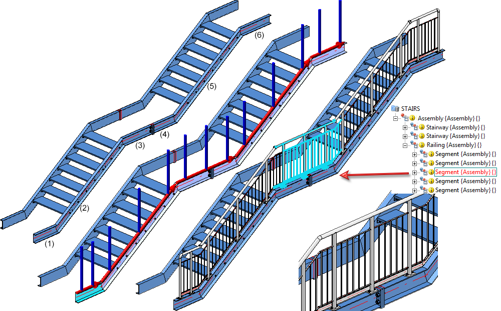 Versions before HiCAD 2016 SP2 would have created 6 "Segment" assemblies, with two separate railing segments for the beams (3) and (4), i.e. one for beam (3) and one for beam (4).