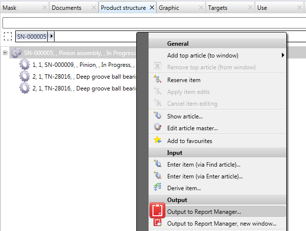 To do this, open the desired article in the HELiOS Desktop and open the Product structure tab. Right-click the desired top article and choose Output to Report Manager....