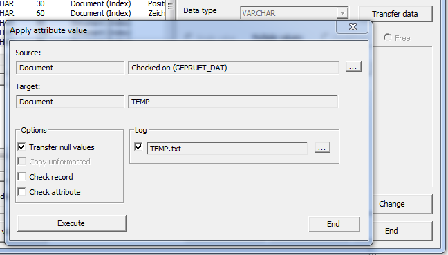GEPRUFT_DAT will be entered as source attribute. You can now enter the options and the protocol for the planned transfer.
