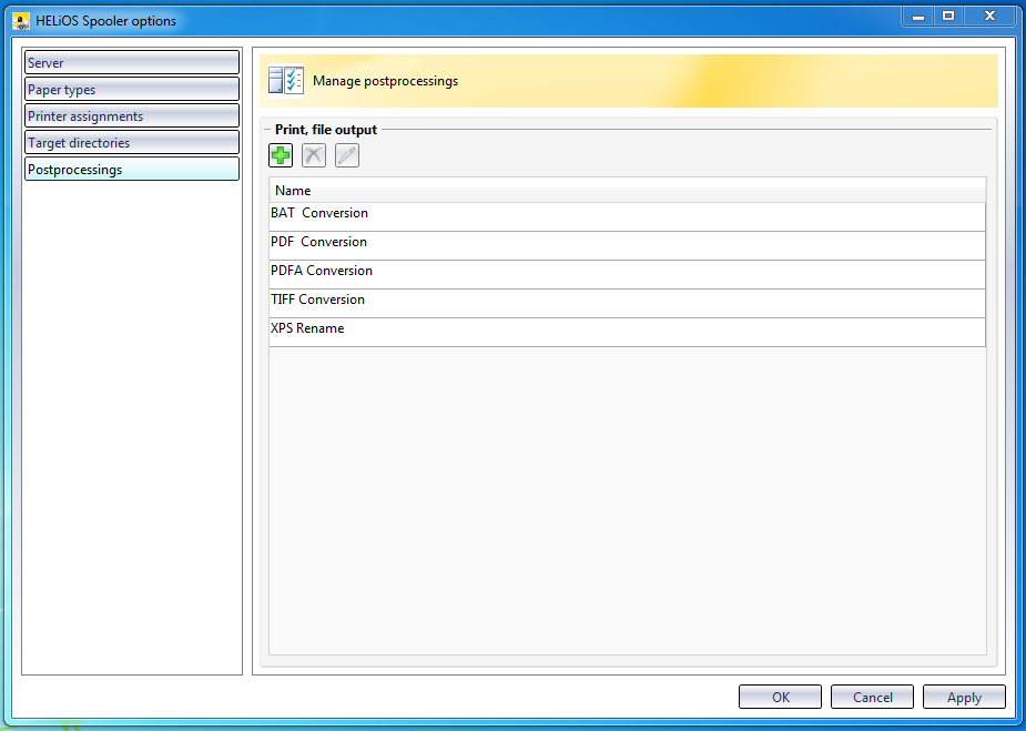 On the Postprocessings tab you can manage the Postscript postprocessings (see also ISD FilePrinter and PostProcessing) of print jobs or file conversions.
