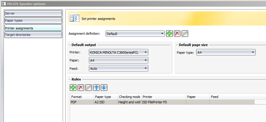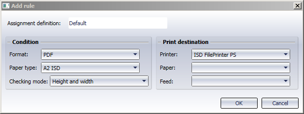 On the right, beneath Print destination, you can select the Printer to which the file is to be sent according to this rule. This make sense if, for example, all exceptional formats which are larger than A3 are not to be sent to the default printer specified on the Assignment definition tab (as this printer is not suitable for this paper size) but to a different to a different printer. Paper and Feed depend on the respective printer type and are optional fields (if no selections are made here, the default settings of the output devices will apply).