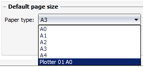 On the right, beneath Default page size you could also assign a user-defined special format as default, e.g. a format called "Plotter01 A0", as defined for Paper type in the screenshot below: