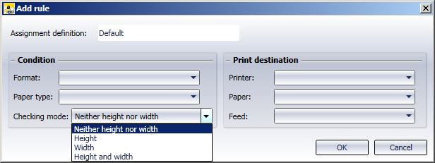 Normally, the Checking mode should be set to Height and width. This will make the Spooler consider the height and the width of a document when deciding whether a currently checked Condition applies. The Checking mode Width allows, for instance, a printing of special formats with various heights, but identical widths on a roll printer. A rule with the Checking mode Neither width nor height applies to all print jobs of the set file format, irrespective of the page size.