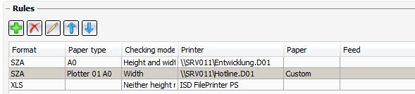 to remove it from the list. Use the arrow keys to move a marked rule up or down in the list. If several rules are required for a particular file format, it is recommended to place the "most specific" rules highest to give them a higher priority than the "more general" rules. Normally you would define, for instance, one or several rules with various paper sizes and the checking mode "Height and width" or (only) "Width" and, further down, one rule with the checking mode "Neither height nor width" to cover the remaining cases.