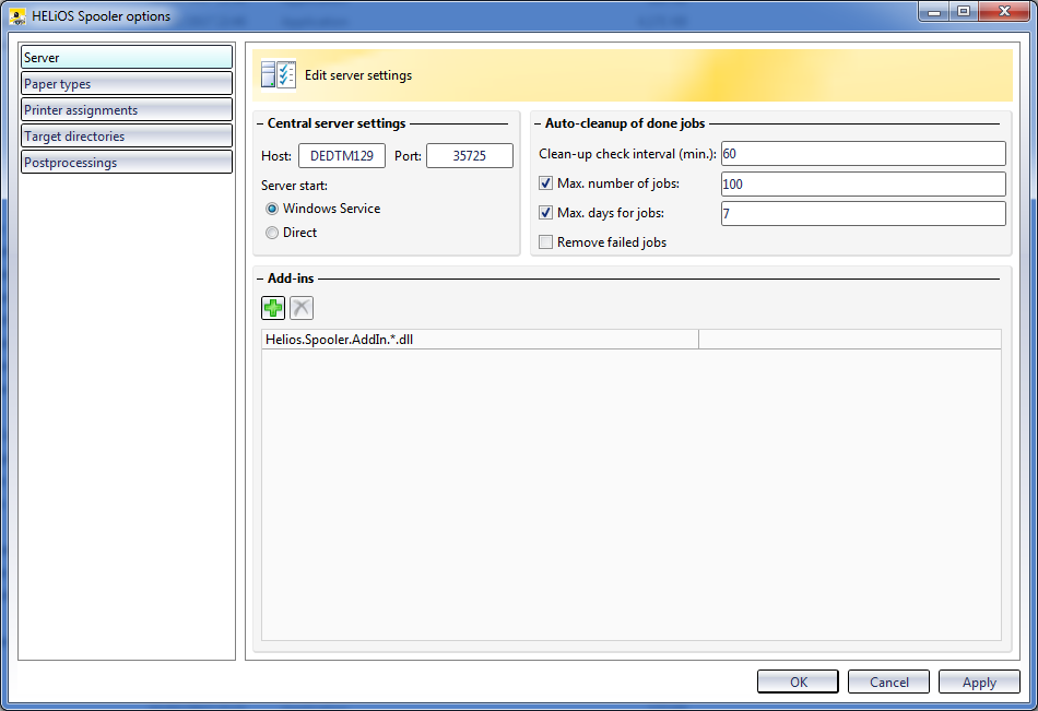 Beneath Server start you can specify how the Spooler Service is to be executed in your system. Normally, it is a Windows Service. Bit if you require an "interactive" Server start, select Direct instead. (please also red the notes on Spooler installation).
