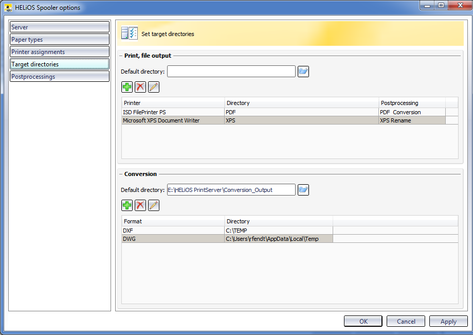 In the Default directory input field, you can specify further rules for target directories and post-processing for various printers.
