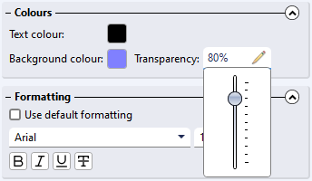 You can change not only the text colour of group frame headings, but also the background colour and its transparency by selecting a different background colour in the Properties window. Under Colours you can use a colour picker and set a manual value between 1% and 90% for Transparency or use the slider: