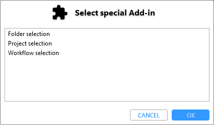 Opens a selection window in which you can choose the desired special element: Folder selection, Project selection or Workflow selection.