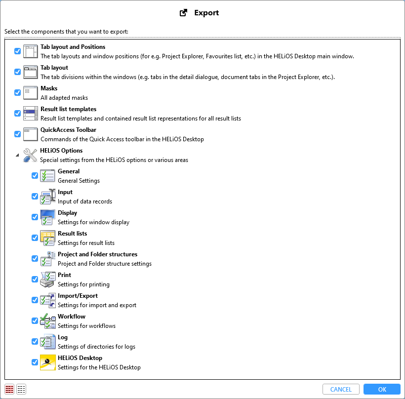 The export of some areas is only offered for selection in the menu window if there are changes or settings in the system that deviate from the HELiOS delivery standard.