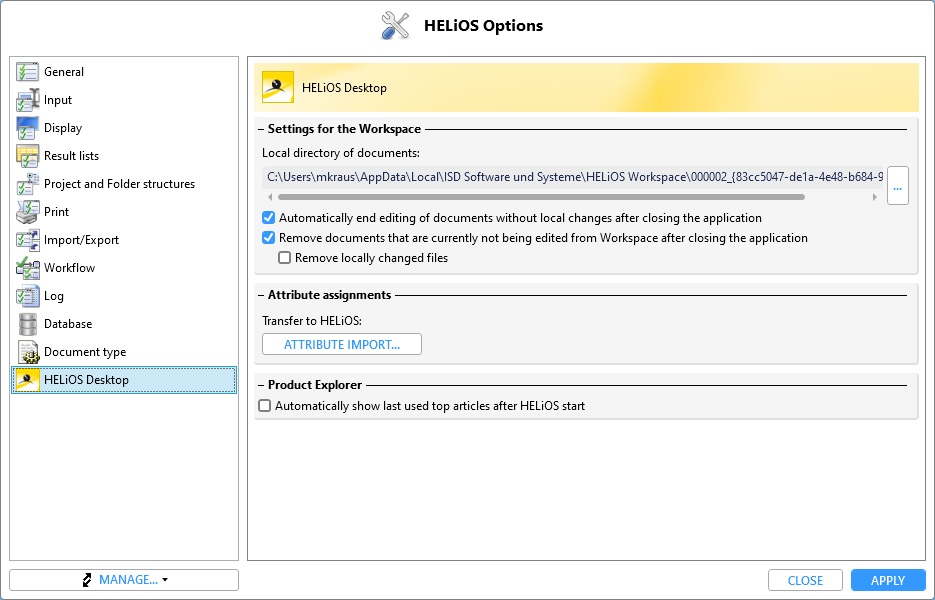 In the start window of the HELiOS Options you will find the setting options for the open application. This means, for example, if you are currently working with the HELiOS Desktop, the HELiOS Options submenu for the HELiOS Desktop is displayed.