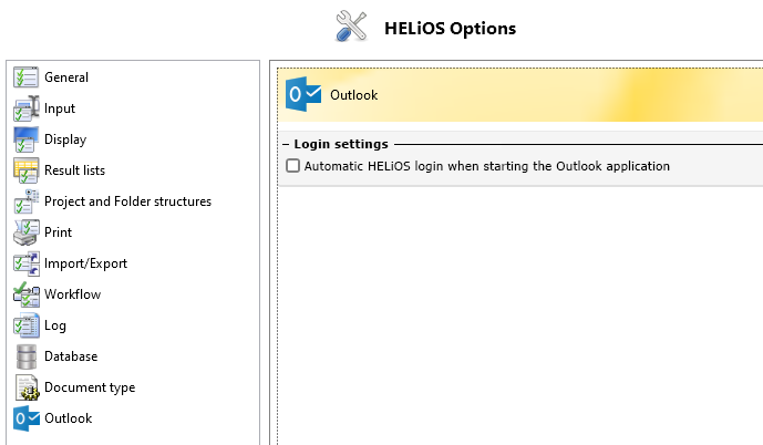 Options in the HELIOS Ribbon of your Outlook interface opens the following dialogue window: