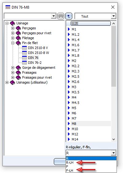 Dans le tableau DIN 76 sous Usinage, général > Usinage > Fin de filet, vous disposez désormais également des filetages gauches (Type F-LH et R-LH).