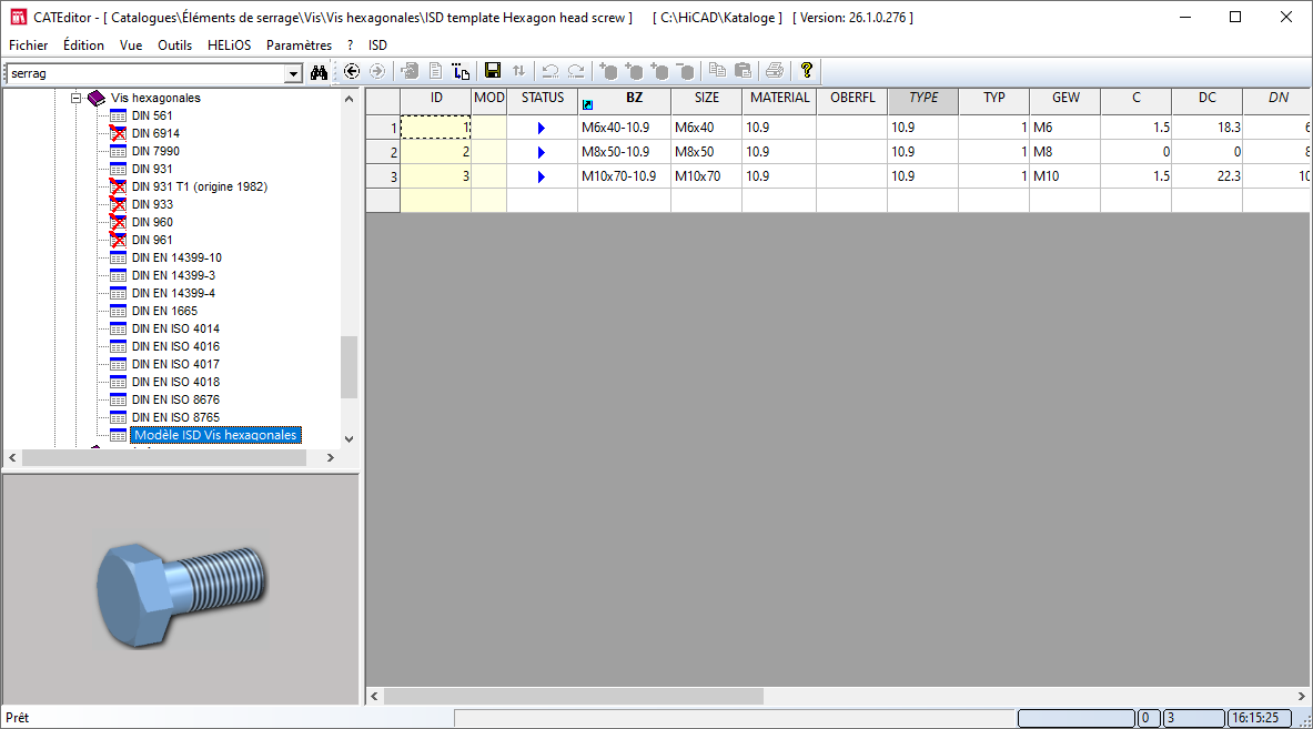 Ce tableau est formé d'un élément 3D standardisé, prédéfini et paramétré par ISD, que vous pouvez utiliser comme une base pour de nouvelles vis à tête hexagonale.