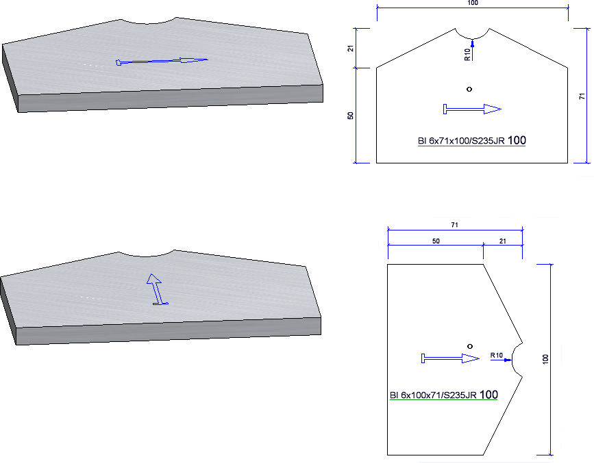 Cette fonction identifie la direction et le côté de l'usinage d'un élément, par exemple un rabat de tôle, afin de spécifier le sens des textures et des revêtements. Vous disposez pour cela dans le catalogue Flèches (Werksnormen/Symbole/Pfeile) des symboles suivants :