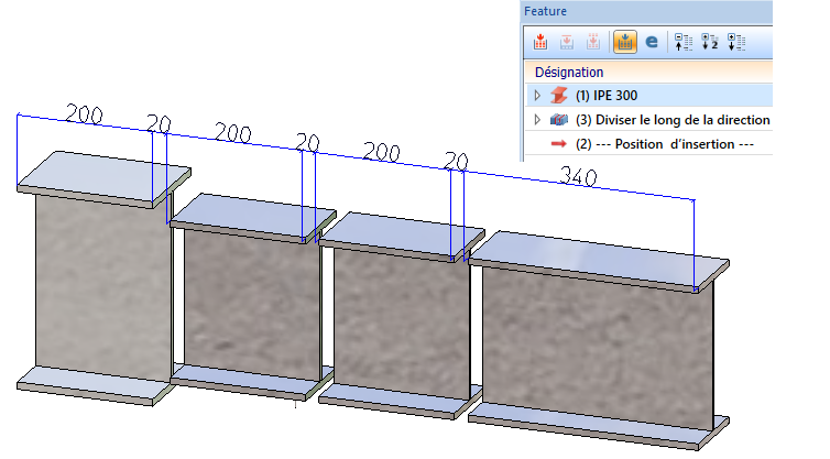 À l'aide de cette fonction, vous pouvez diviser en plusieurs sections les éléments le long d'une direction. Vous disposez pour cela de différentes options de division, par exemple, les éléments individuels peuvent obtenir des longueurs différentes. Par ailleurs, cette fonction crée un Feature correspondant, de sorte que la division pourra être modifiée par la suite.