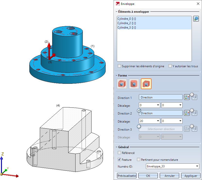 Si vous sélectionnez comme forme Translation, la case Y autoriser les trous est alors également présente. En cochant cette case, il est possible de prendre en compte les trous (par exemple, les perçages) dans l'original comme dans l'enveloppe.