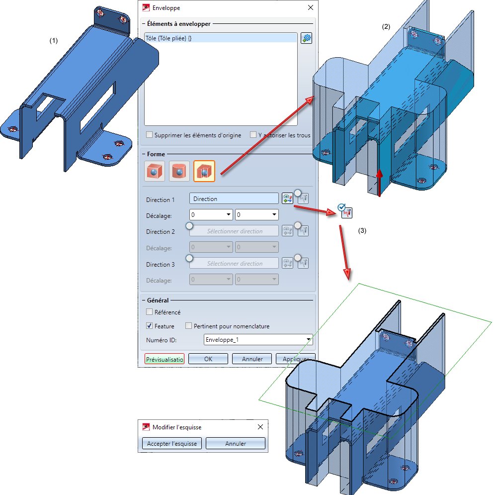 Les enveloppes sont des solides et, comme tous les autres éléments, peuvent être référencés, retravaillés comme Feature ou pertinent pour la nomenclature. Vous disposez donc des cases correspondant à ces actions.