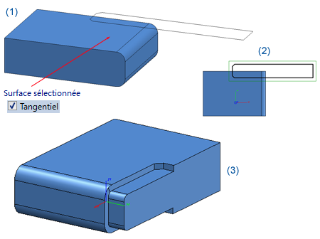 Cliquez sur le symbole et identifiez les surfaces de l'élément concerné. Si la case Tangentiel est cochée, les surfaces qui sont connectées aux surfaces sélectionnées par des arêtes tangentielles seront alors prises en compte.