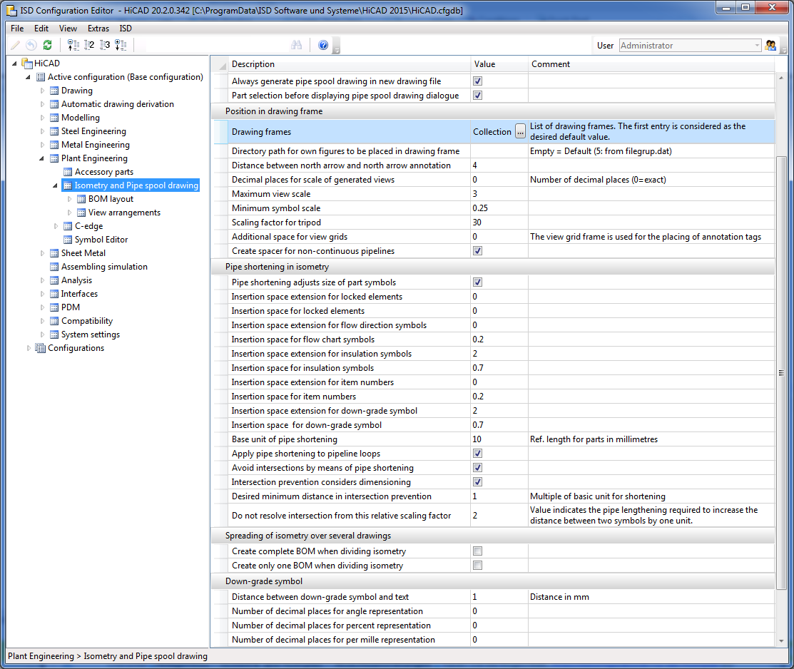The settings in the Configuration Editor, at ...> Plant Engineering > Isometry and Pipe spool drawing will be considered for isometry and pipe spool drawing generation.