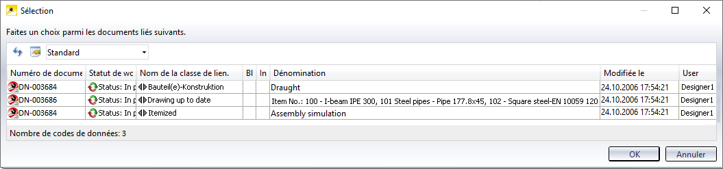 Si plusieurs éléments/profilés existent dans le dessin, une liste des numéros de repère sera éditée - regroupés de façon logique