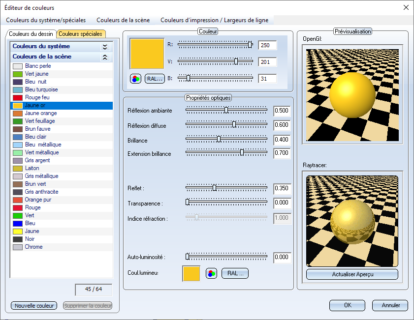 Paramètres de couleurConfigurations des couleursCouleurs de la scèneCouleurs du système/spéciales