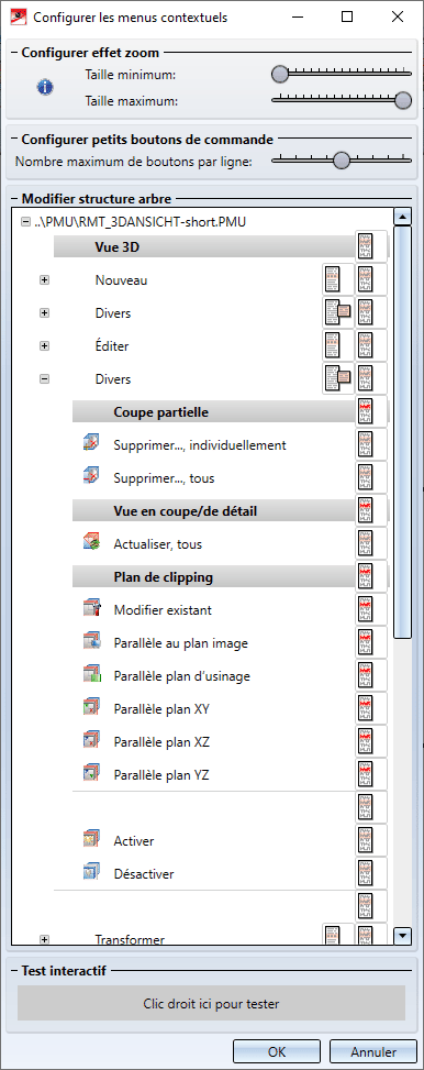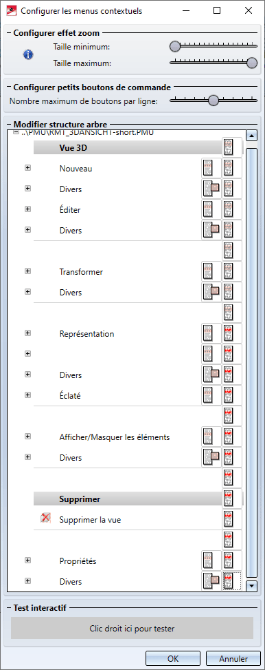 En quittant la fenêtre de dialogue par OK, les paramètres choisis seront appliqués au menu contextuel.