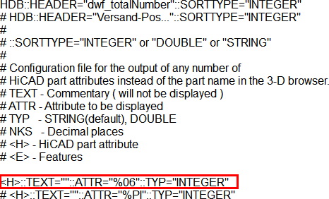 La ligne entourée en rouge définit le contenu de la 1re colonne utilisateur. Le réglage prédéfini par ISD est l'attribut %06, c.-à-d. le Nombre total. Vous pouvez également spécifier plusieurs lignes et signaler les autres colonnes comme commentaire en faisant commencer la ligne par le signe #. Dans le fichier représenté ci-dessus , c'est le cas pour le l'attribut %PI, c.-à-d. le numéro de repère de commande. À titre d'exemple, vous pourriez supprimer le signe de commentaire # de la ligne %PI et à la place le mettre devant la ligne %06. Dans l'ICN, c'est alors le numéro de repère de commande qui se retrouvera dans la première colonne utilisateur.