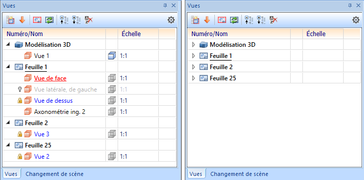L'onglet Vues comprend la structure de vue de la scène actuelle. HiCAD différencie les vues de modélisation et de feuille.