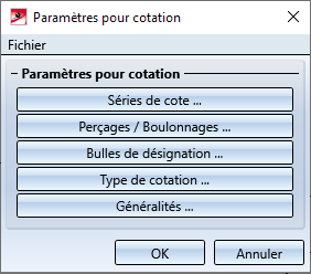 Après avoir lancé la fonction, la fenêtre Paramètres pour cotation s'ouvre. Sélectionnez par un clic sur un des boutons la fenêtre de paramètres à laquelle vous voulez accéder.