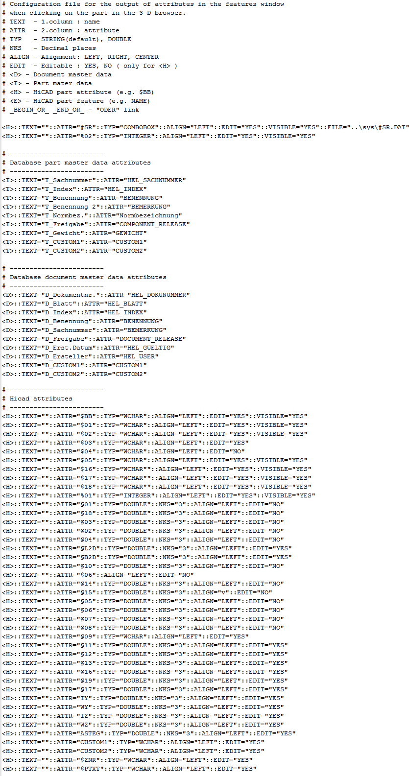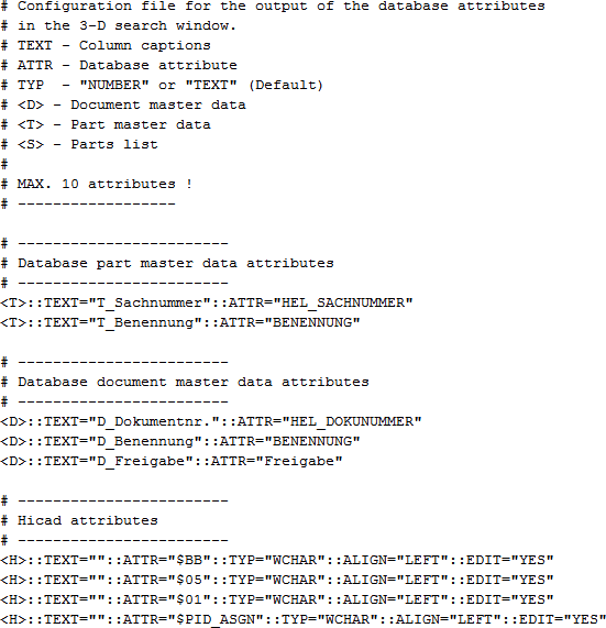 Les fichiers HDB commençant par BRW (soit BRW*.HDB) déterminent l'édition des éléments et des données de la scène dans l'ICN (ex. la fenêtre des Propriétés et la Structure d'élément 3D), ainsi que la liste des résultats d'une recherche. À titre d'exemple, le fichier système BRW_3DTeilattr.HDB définit quels attributs d'un élément 3D seront affichés à la place du nom de l'élément.