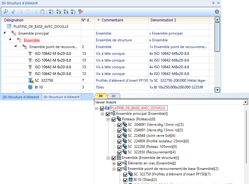 Affichage de la structure en une colonne, propriétés HiCAD |
