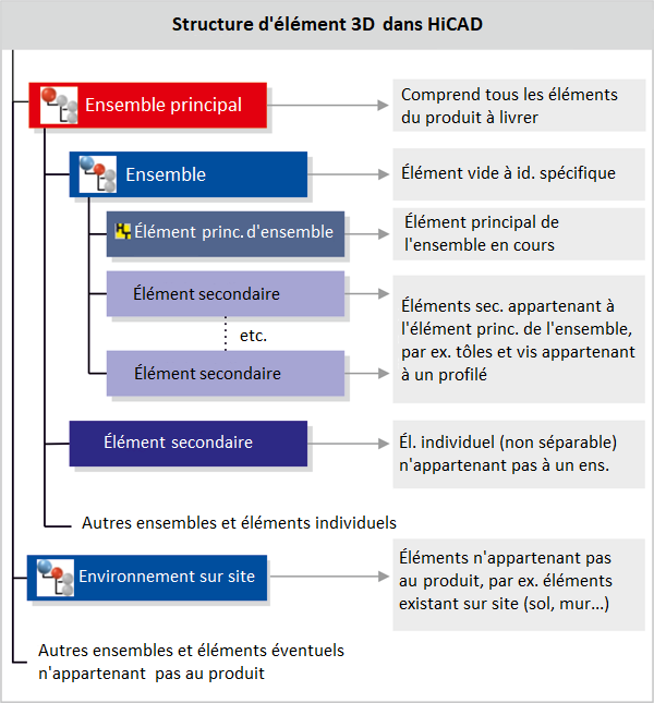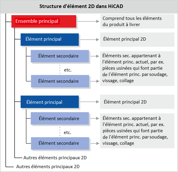 Une scène HiCAD se compose en tout premier lieu d'élément 2D et/ou 3D. Il peut s'agir d'éléments individuels ou d'ensembles. Dans HiCAD, une différence est opérée entre les éléments principaux et les éléments secondaires. Cela représente la base d'une structure d'élément pertinente.