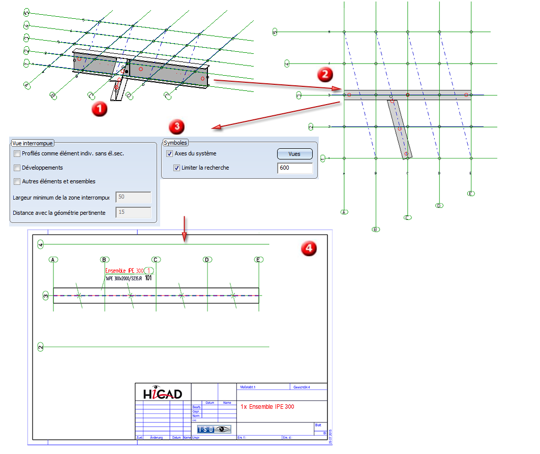 Les profilés peuvent être représentés en interrompue dans le dessin d'exécution. La représentation interrompue pour les profilés est le paramètre prédéfini par ISD. - Représenter les vues des développements (projections développées) de façon interrompue