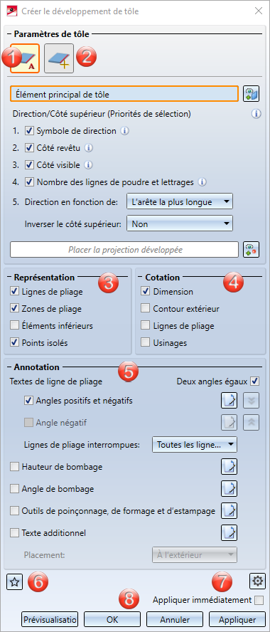 Vous avez la possibilité de spécifier les paramètres du développement au moment de le créer. Les fonctions permettant de modifier les paramètres se trouvent sous Tôle pliée > Développement de tôle > Menu déroulant Actu.