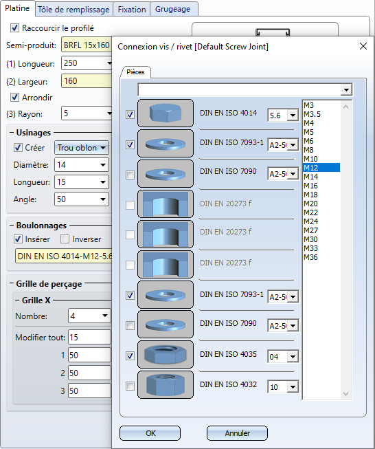 Avec des vis bilatérales, ce sont des douilles avec filetage qui seront utilisées. Le type de Vis, de Rondelle et de Douille peut être sélectionné à partir du catalogue. En sélectionnant d'autres vis, les rondelles et les douilles seront automatiquement corrigées. Il est cependant possible d'attribuer, pour autant qu'il est disponible dans le catalogue, par exemple un autre matériau aux éléments.