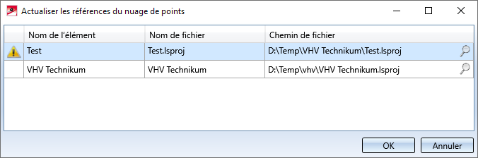 Après avoir cliqué sur la loupe et sélectionné le nouveau chemin d’accès, fermez la fenêtre de dialogue en cliquant sur OK. Vous pouvez également échanger le nuage de points. Les références du nuage de points seront mises à jour et, le cas échéant, le nuage de points sera échangé.