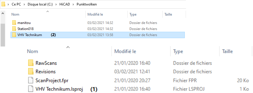 Pour transférer la scène contenant le nuage de points vers un poste tiers, il faudra donc également transférer la totalité du dossier (2). Sur le nouveau poste, ce dossier doit également se trouver dans le chemin d’accès C:\hicad\install\punktwolken. Autrement, le nuage de points ne sera pas trouvé.
